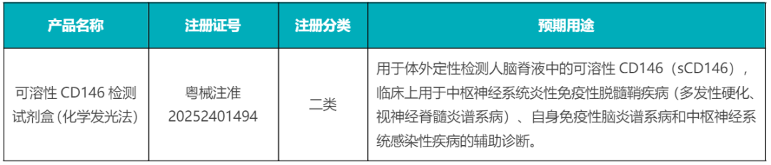 研究表明,在多发性硬化症(MS)、视神经脊髓炎等中枢神经系统免疫性炎性脱髓鞘病人中,脑脊液中sCD146的浓度明显升高。这类疾病早期症状不典型、缺乏特异性的指标,易与其他神经系统疾病混淆。同时,疾病活动度判断、复发预警及特殊人群(如抗体阴性者)诊断缺乏可靠依据,易导致漏诊或延误诊断。